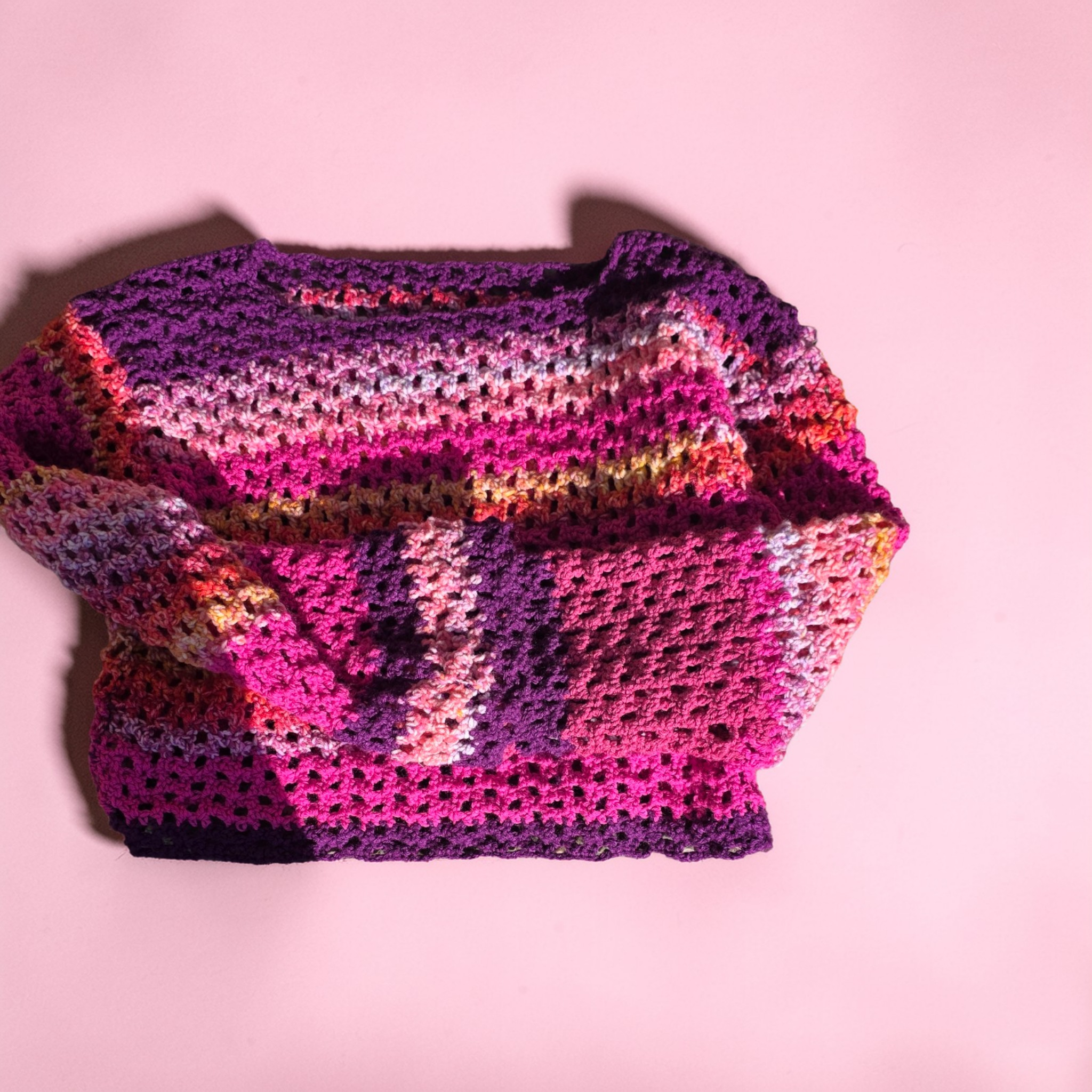 Add a vibrant handmade piece to your wardrobe with this Colorful Crochet Mesh Sweater, a breathable boho crochet top designed for effortless layering and everyday style. This handmade crochet pullover features an open knit design crafted with soft cotton yarn in beautiful multicolor tones of yellow, green, and purple, giving it a playful and artistic look.