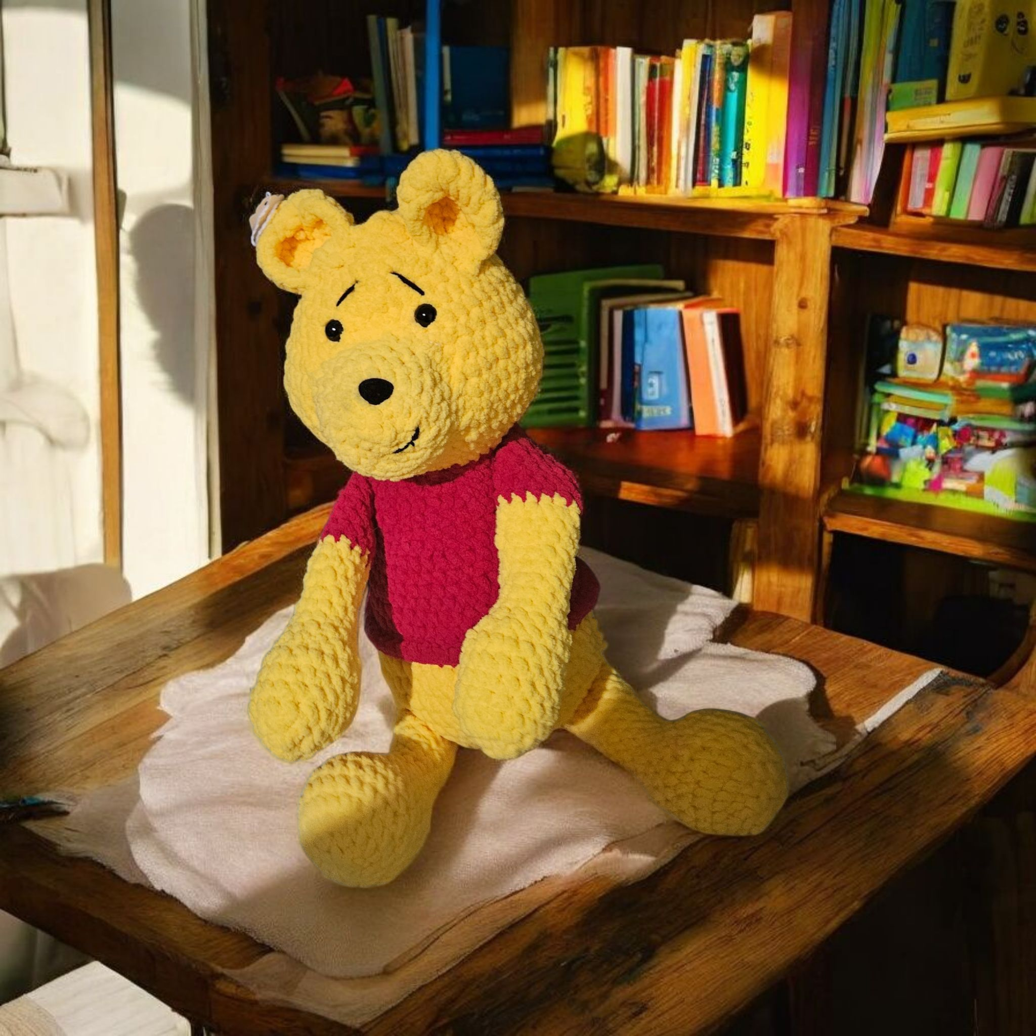 Celebrate friendship with winnie the pooh. This adorable 14-inch seated (large) and 8 inch standing (small)pooh bear brings the story to life. These crocheted bears are not only a cuddly companion but also a thoughtful gift and an impressive keepsake for any reader or kid at heart.