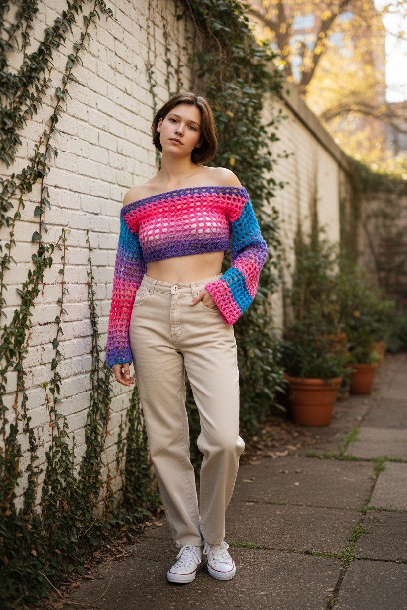 This crochet shrug features a breathable open-mesh stitch and vibrant gradient yarn that blends bold pink, purple, and blue tones. The cropped off-shoulder design creates a relaxed silhouette that pairs perfectly with casual outfits, festival looks, or everyday streetwear.